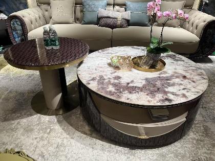 - Elegant round side table featuring a refined Portofino finish.