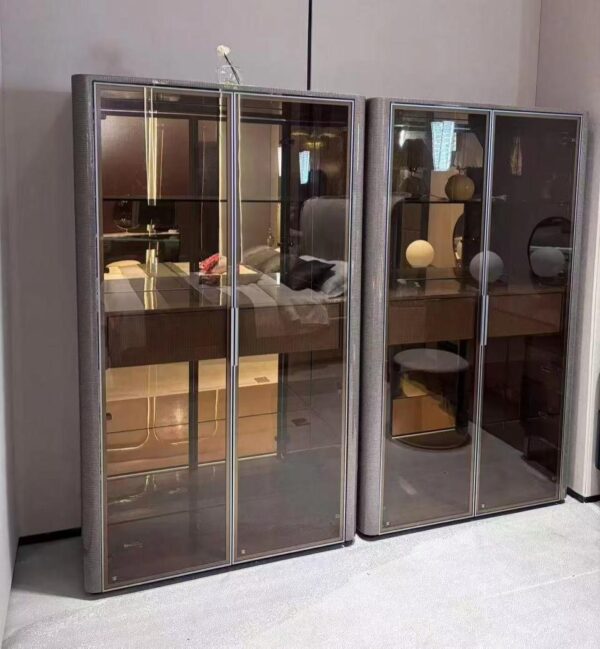 - Elegant two-door wine cabinet featuring a refined Nice wood grain with speckled pattern.